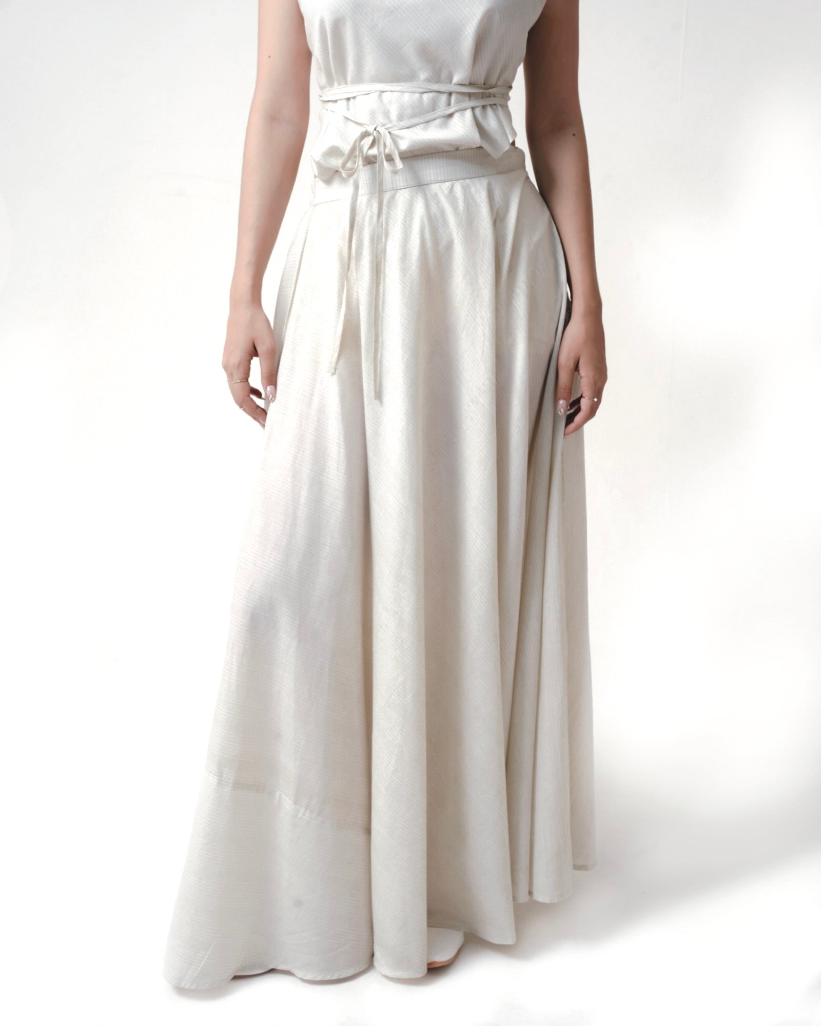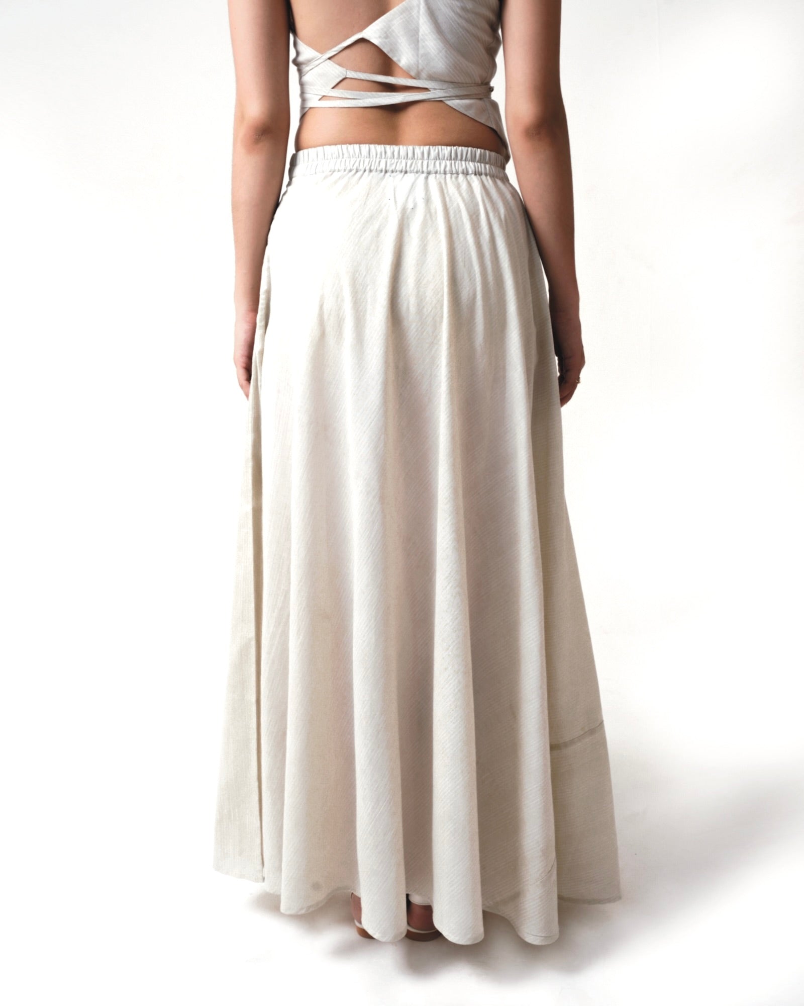 Featuring a high, elasticated waist, the skirt offers both comfort and a streamlined fit, accentuating the waist while allowing for easy movement. The full-length flowy design creates a graceful A-line silhouette that sways beautifully with each step. Perfect for both casual outings and more formal occasions, the "Viella" skirt embodies timeless grace and versatility, making it a must-have addition to any wardrobe.