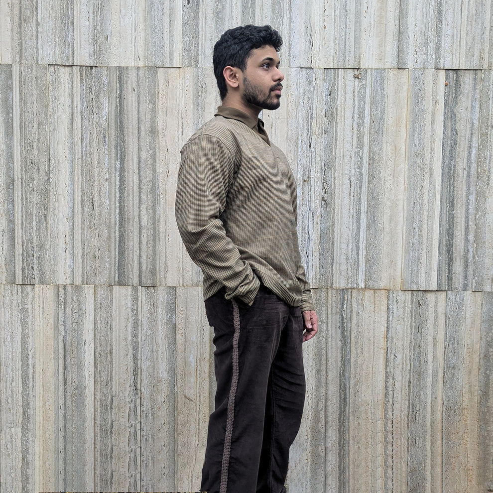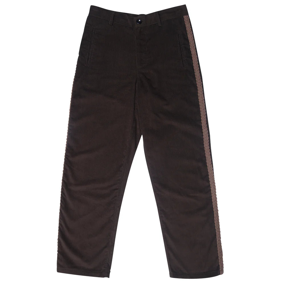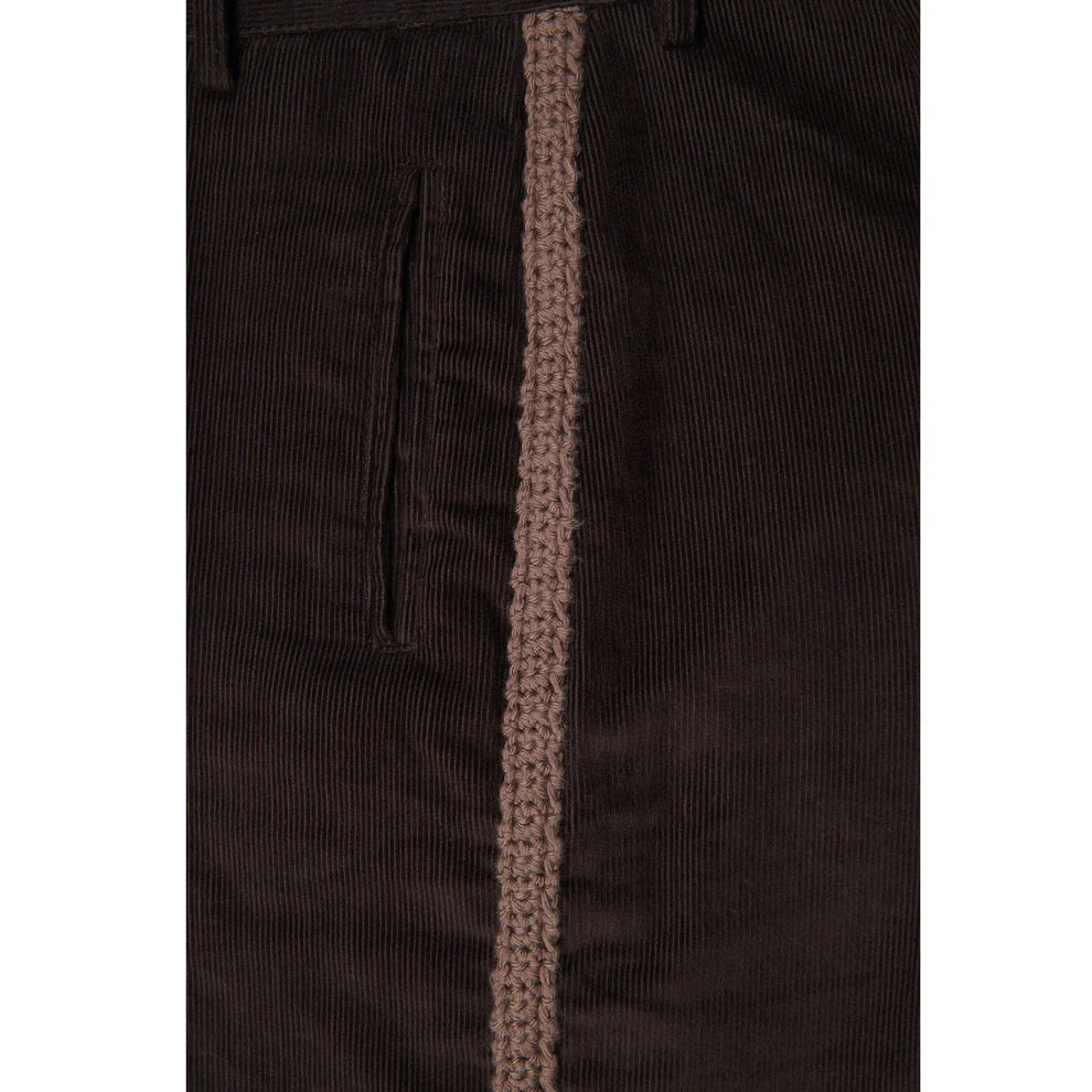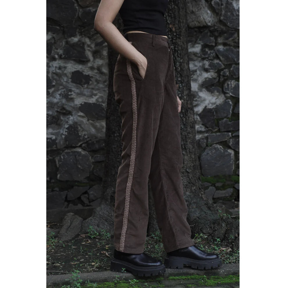 Corduroy pants made with 100% organic cotton with hand done crochet tapes and pockets on both sides and a welt pocket at the back.