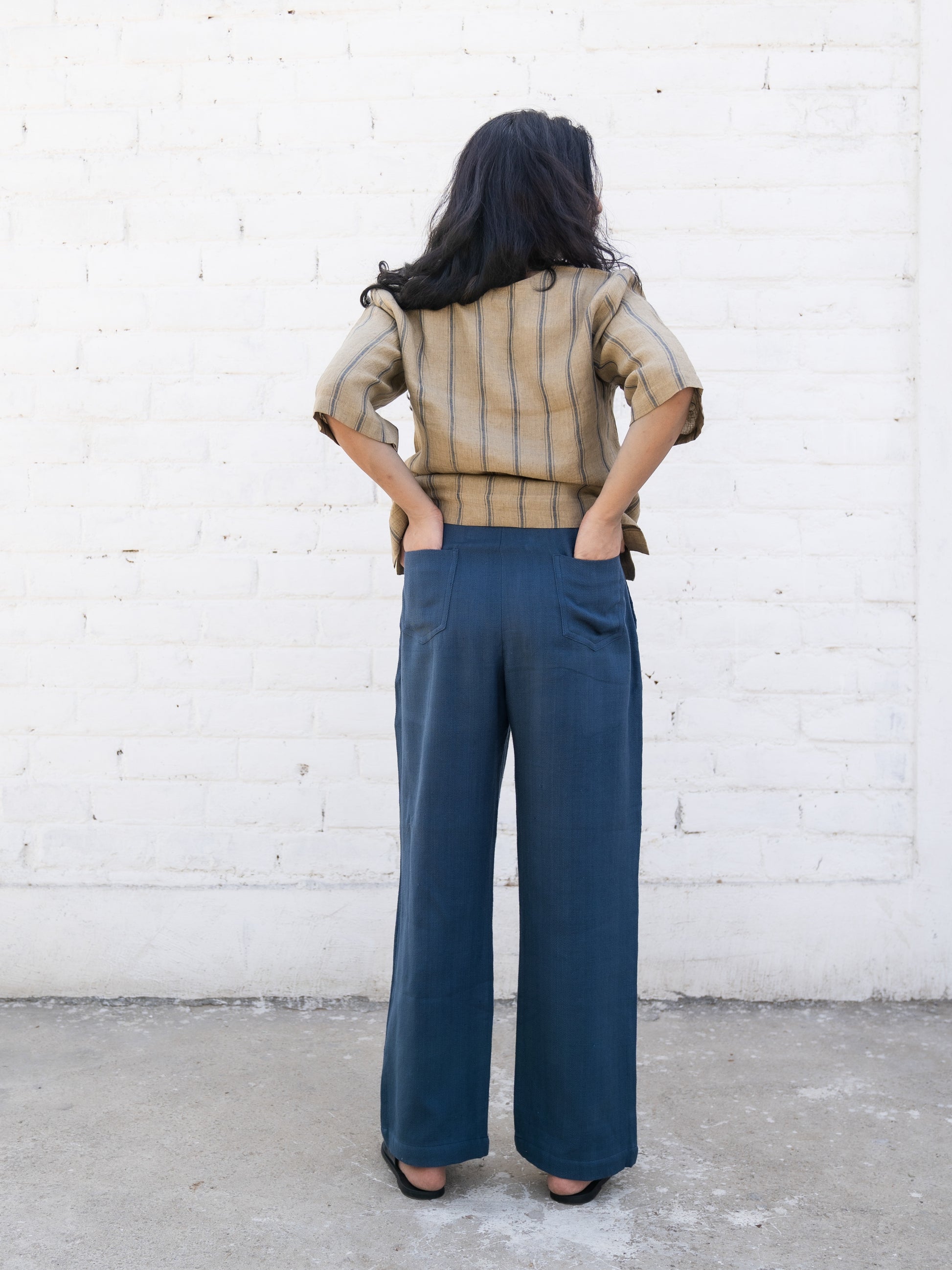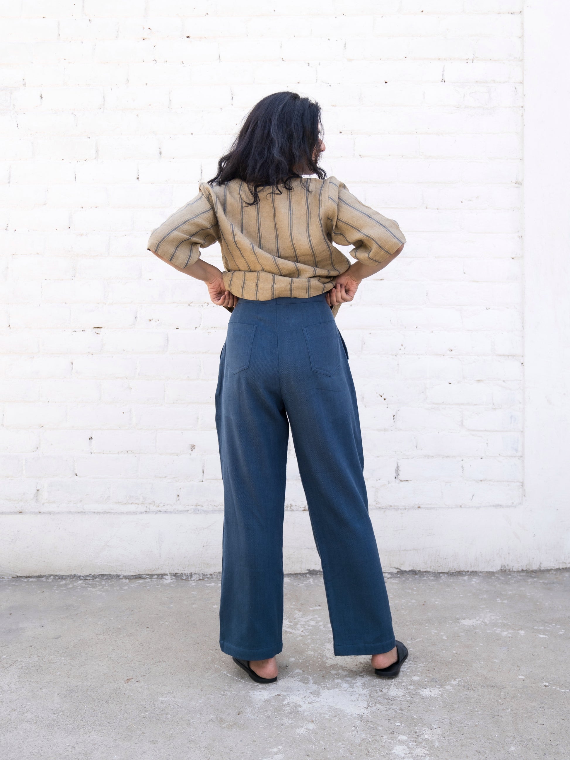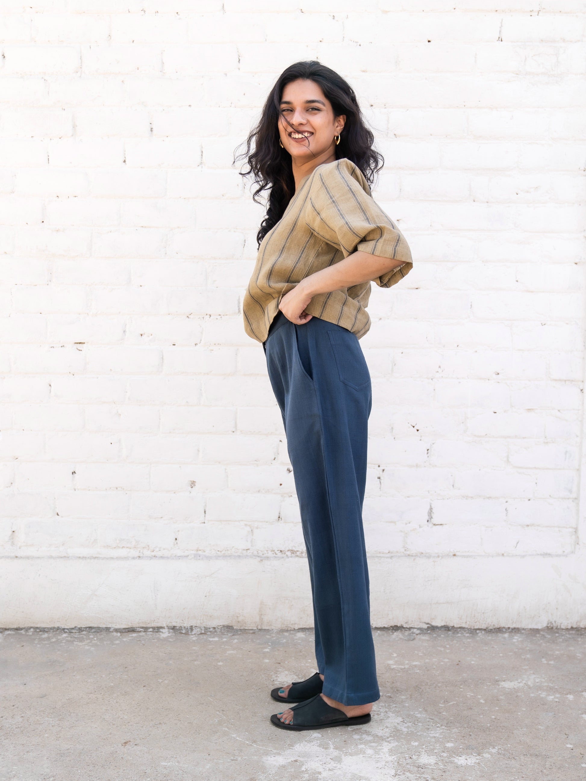 Our classic V-neck everyday top in a fresh textile, this time in a lighter linen featuring navy stripes on a moss green base. Dyed at the yarn stage using azo-free colours.