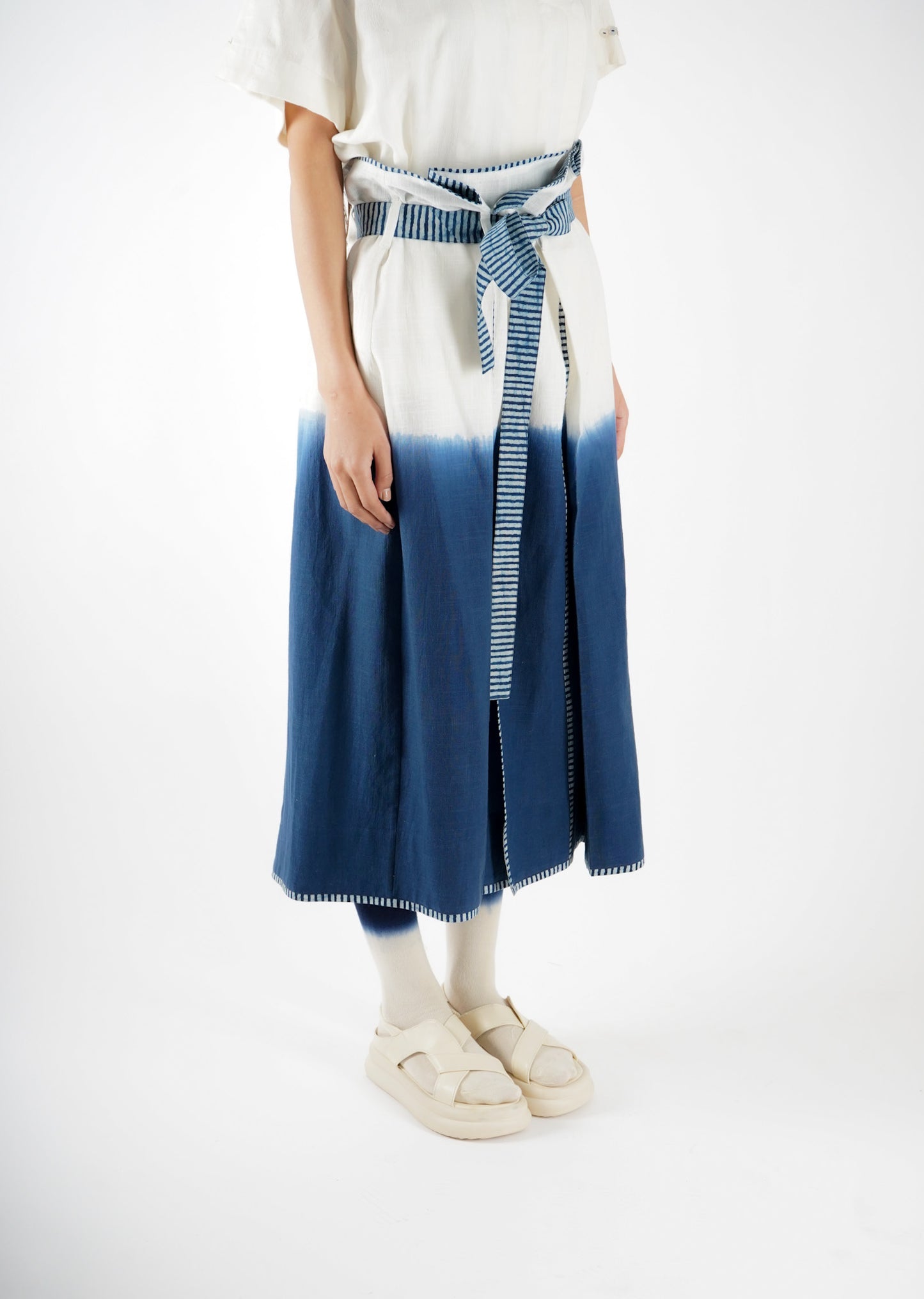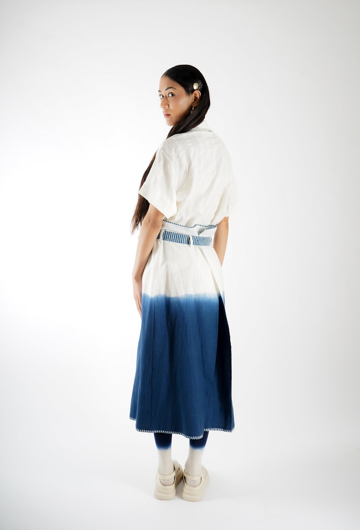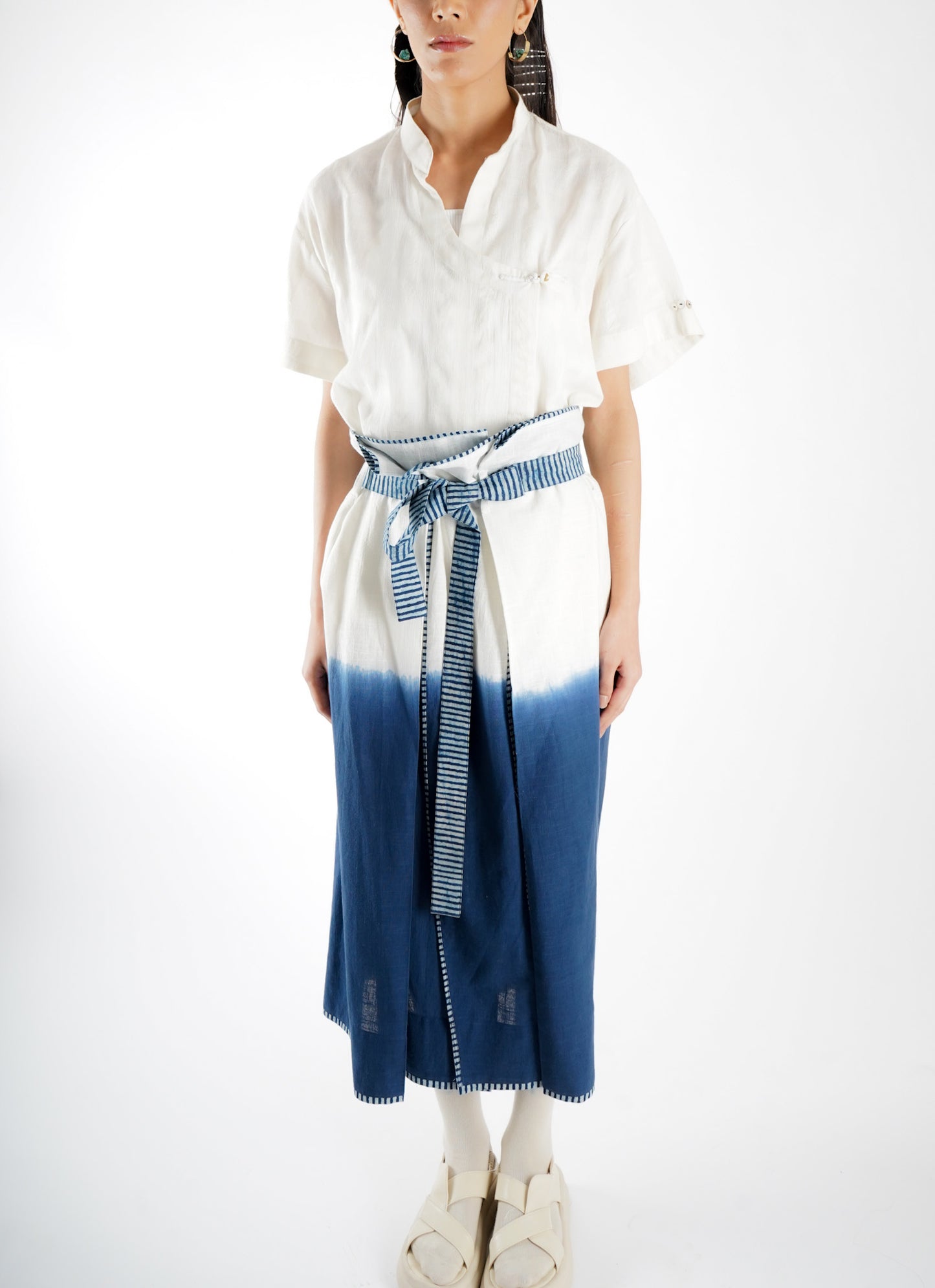 The design of Saldon Summers showcases a beautiful blend of artisanal craftsmanship and contemporary aesthetics. It features Indigo ombre dyeing, creating a smooth gradient effect that adds depth and dimension to the fabric. Complementing this, the outfit is adorned with Ajrakh-striped block print details, a traditional hand-block printing technique known for its intricate geometric and floral patterns. The combination of these elements results in a unique, handcrafted piece that celebrates heritage artistry while maintaining a modern appeal.