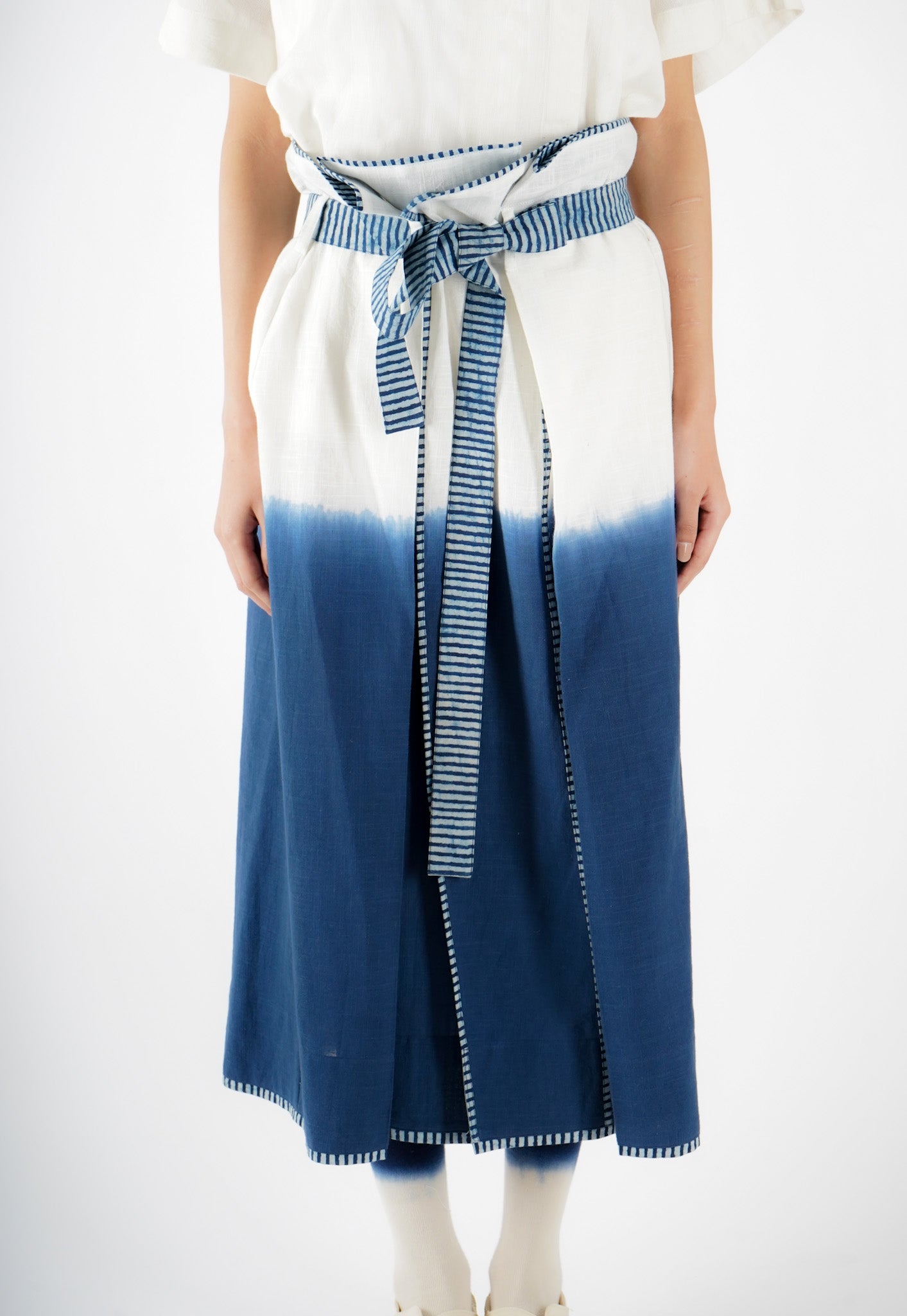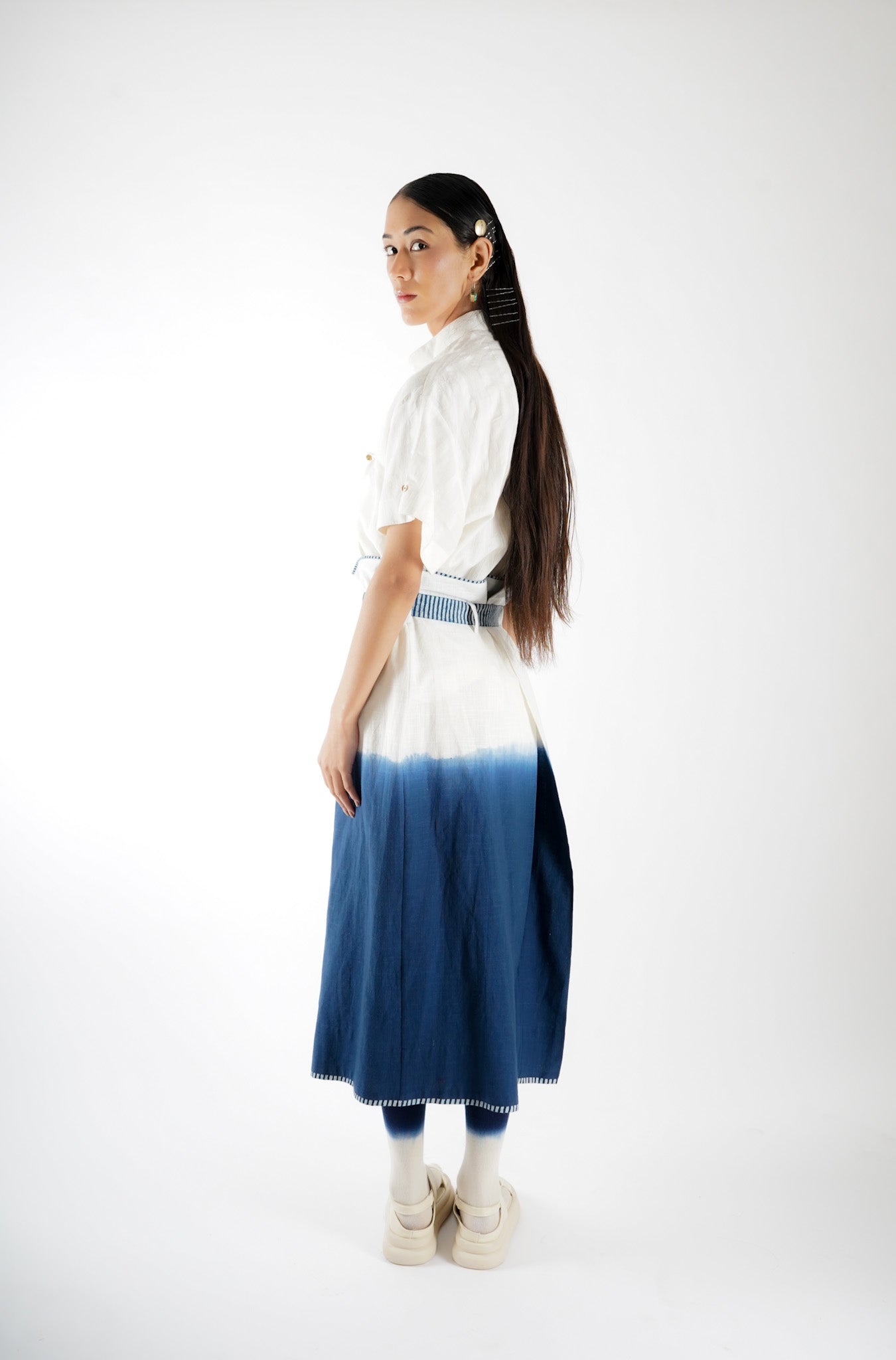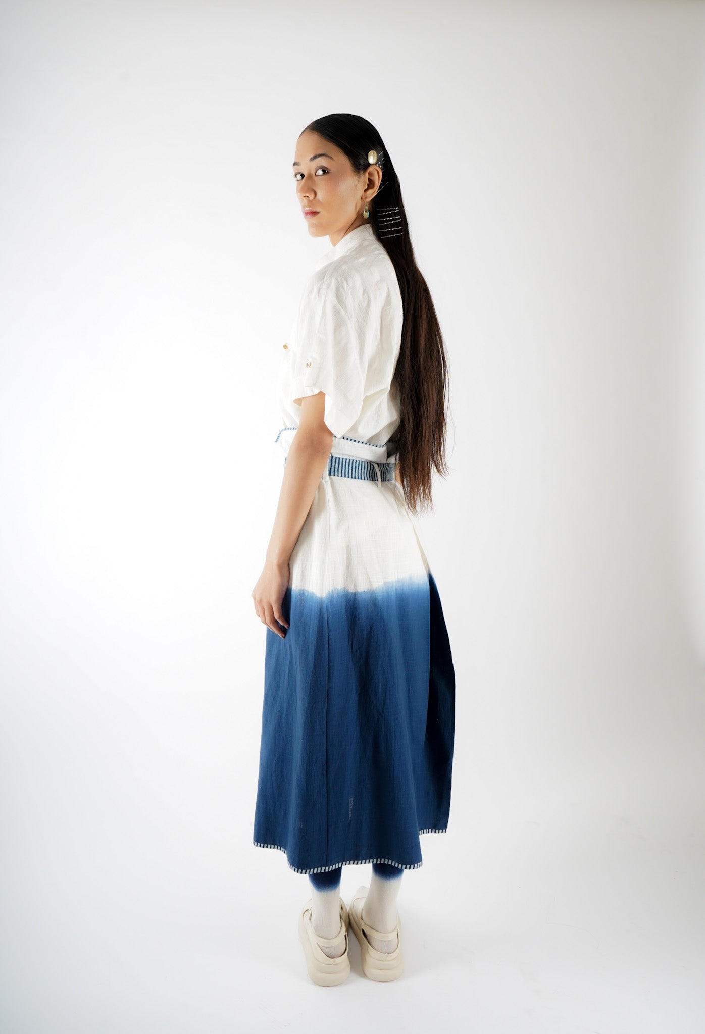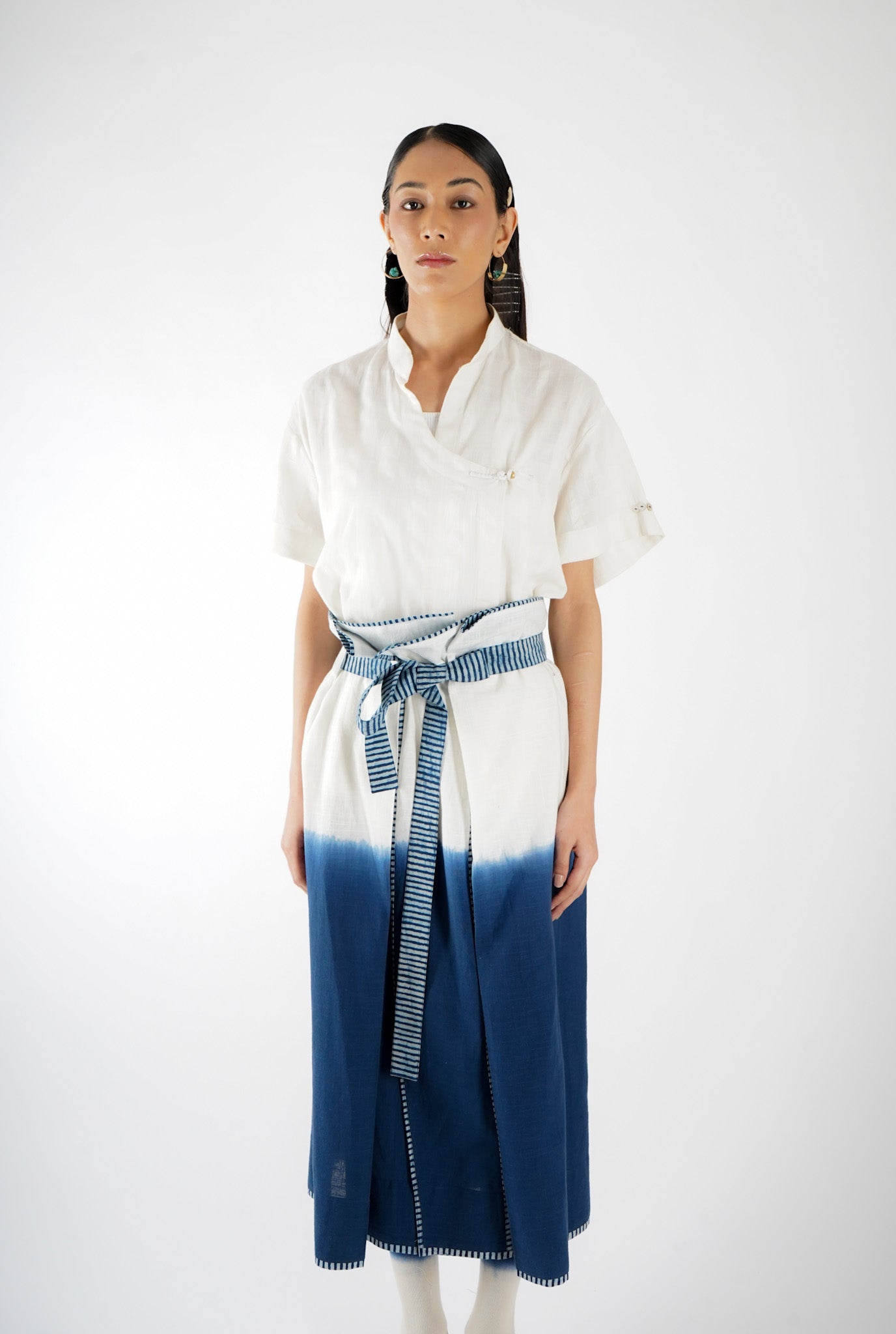 The design of Saldon Summers showcases a beautiful blend of artisanal craftsmanship and contemporary aesthetics. It features Indigo ombre dyeing, creating a smooth gradient effect that adds depth and dimension to the fabric. Complementing this, the outfit is adorned with Ajrakh-striped block print details, a traditional hand-block printing technique known for its intricate geometric and floral patterns. The combination of these elements results in a unique, handcrafted piece that celebrates heritage artistry while maintaining a modern appeal.