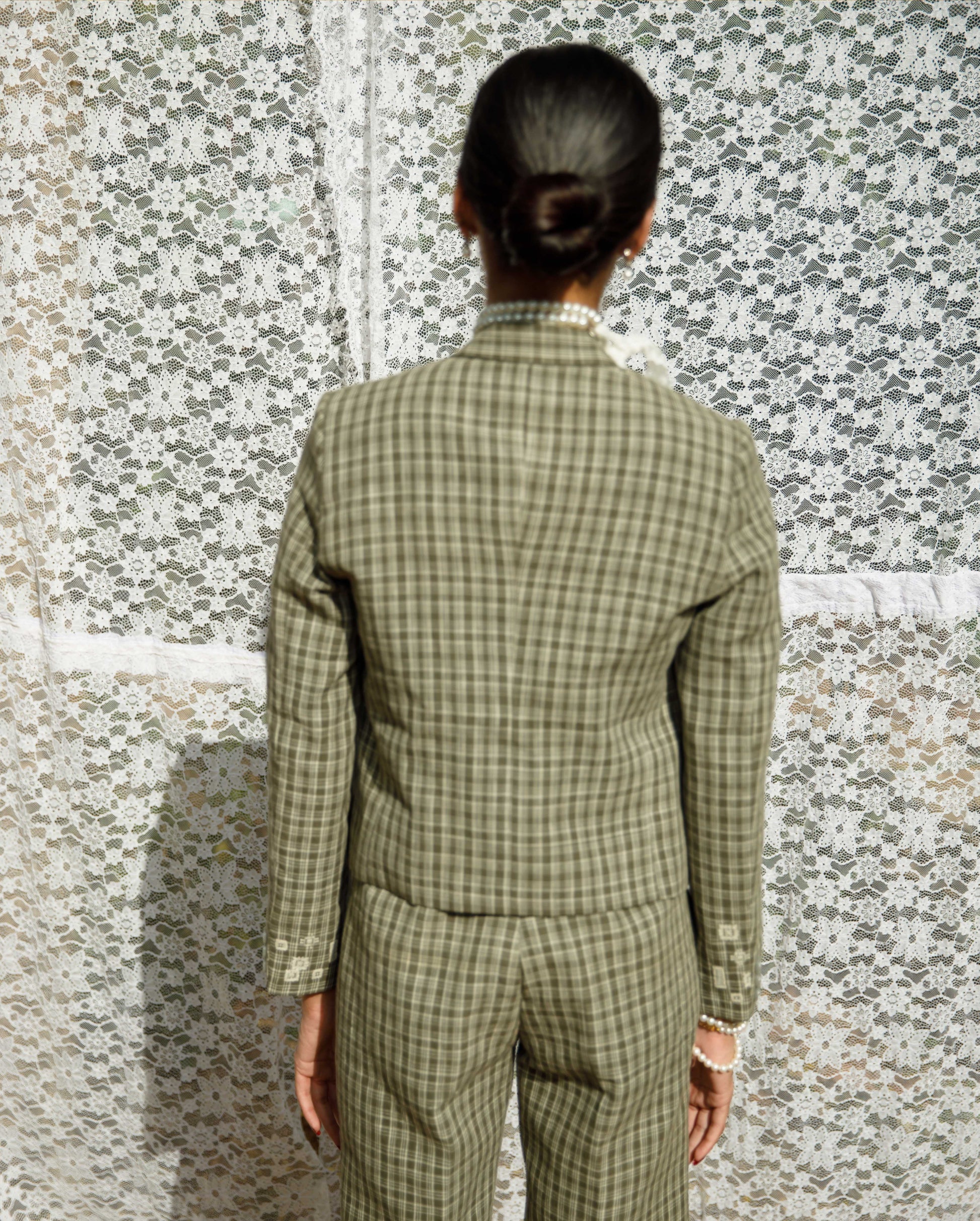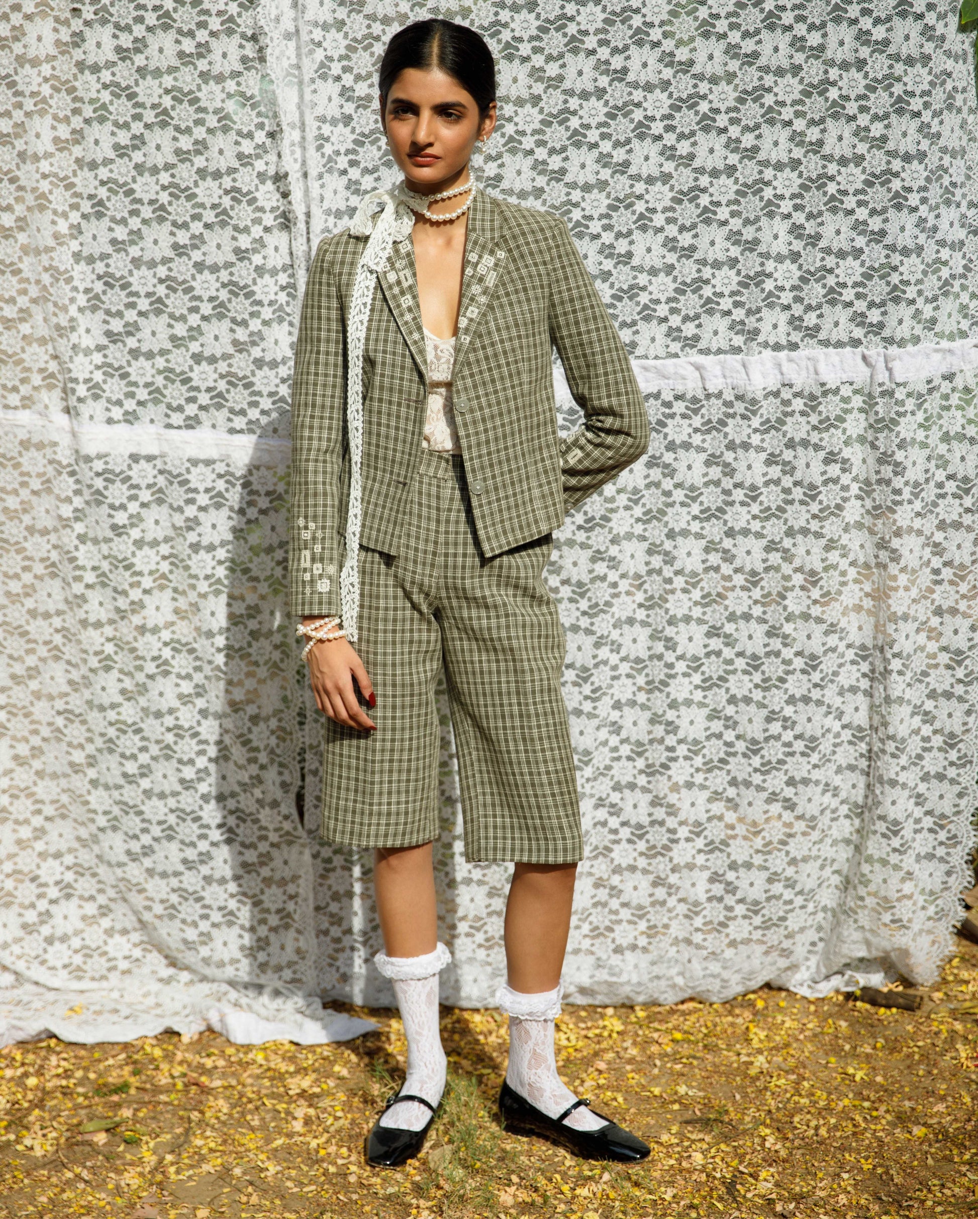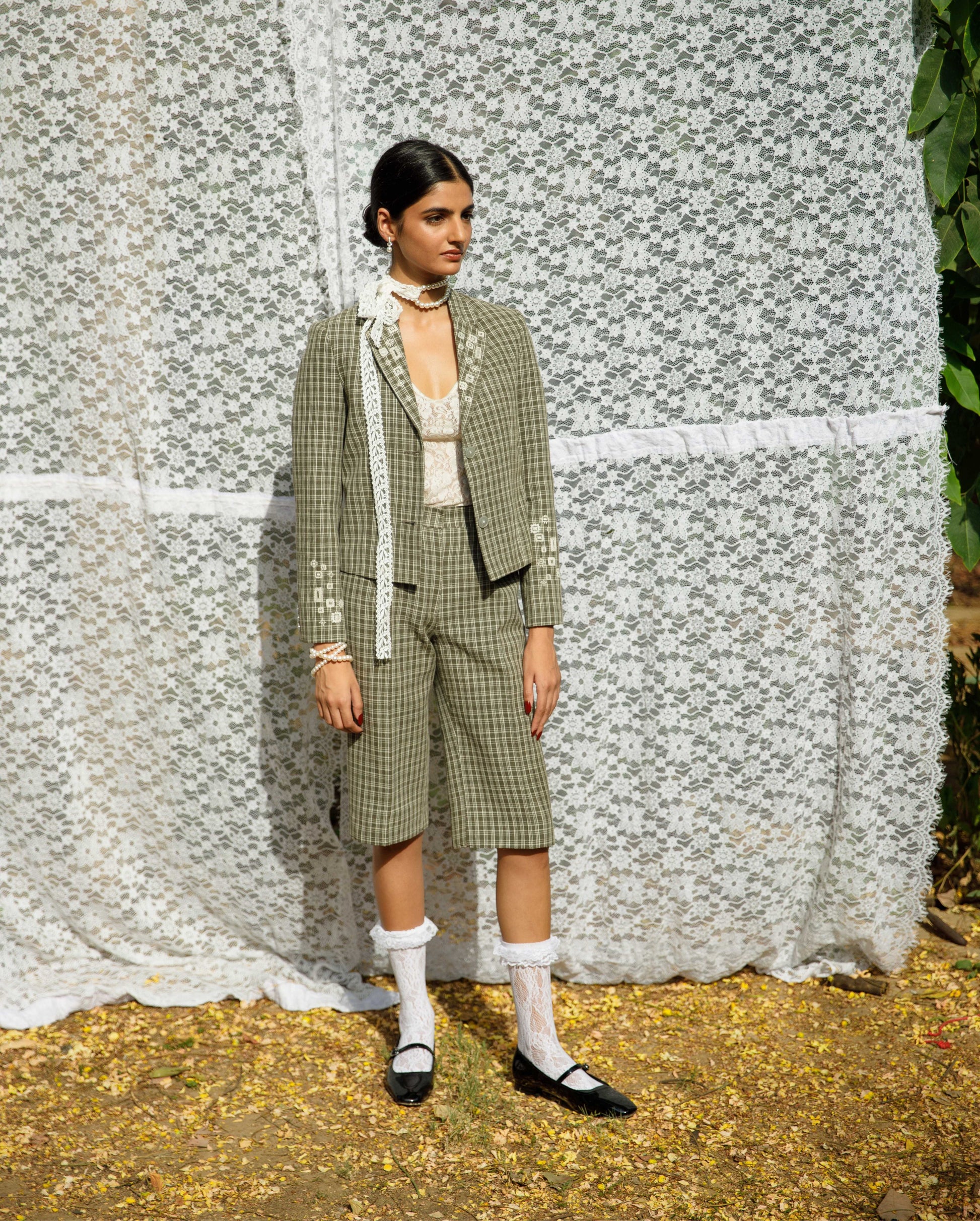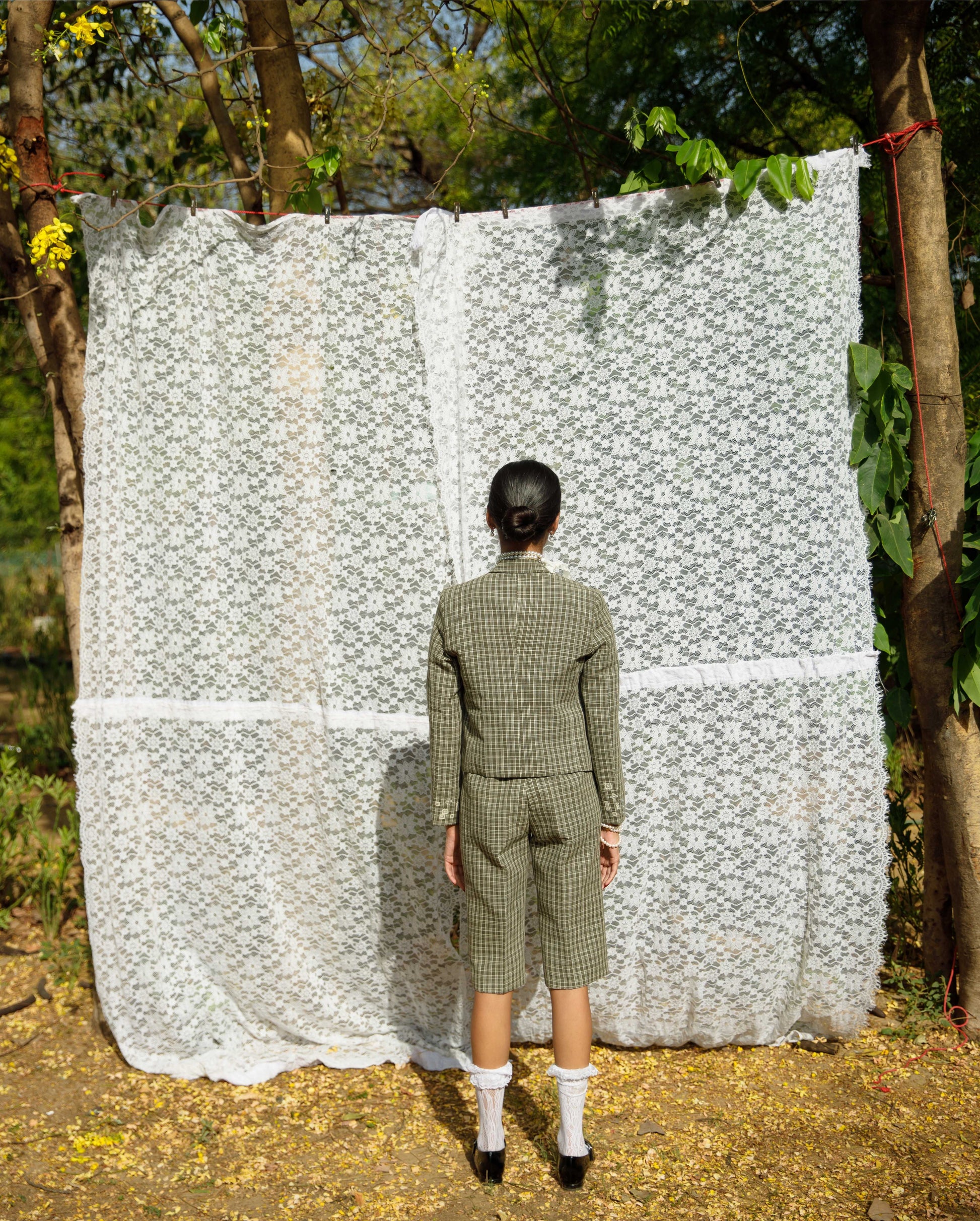 The Zira suit set combines natural pomegranate-dyed cotton woven in malkha, with detailed geometric aari handwork. Designed to be cherished heirlooms in our wardrobes, ensuring wearability and character.